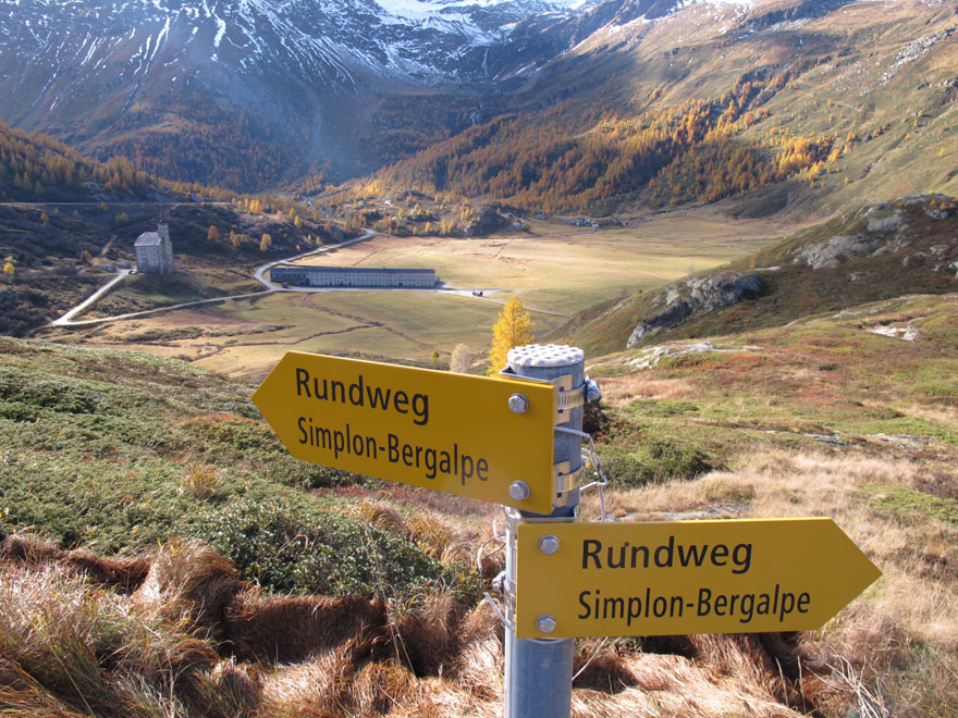 Rund um Simplon Pass, ab Hotel Bellevue Der Rundweg verbindet auf teils historischen Wegstücken die verschiedenen Alpstäfel. Dabei durqueren die Besucher die typische Passlandschaft der Simplon Bergalpe und können an den 12 Stationen Kulturgüter von teils nationaler Bedeutung besichtigen.