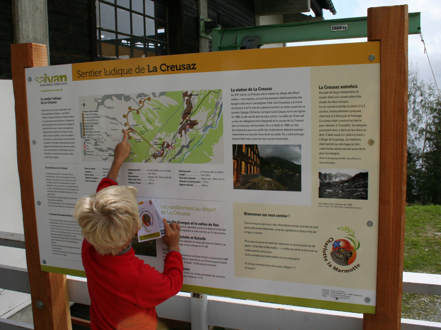 Ab der Bergstation der Gondelbahn La Creusaz (Les Marécottes)Folgen Sie Charlotte dem Murmeltier durch die durch Geröll und Lawinen gekennzeichnete Landschaft. Dieser Pfad befasst sich mit den Naturgefahren und wie sich der Mensch vor ihnen schützt. Sie entdecken auch die Fauna, die Flora und die Geschichte des Gebietes.